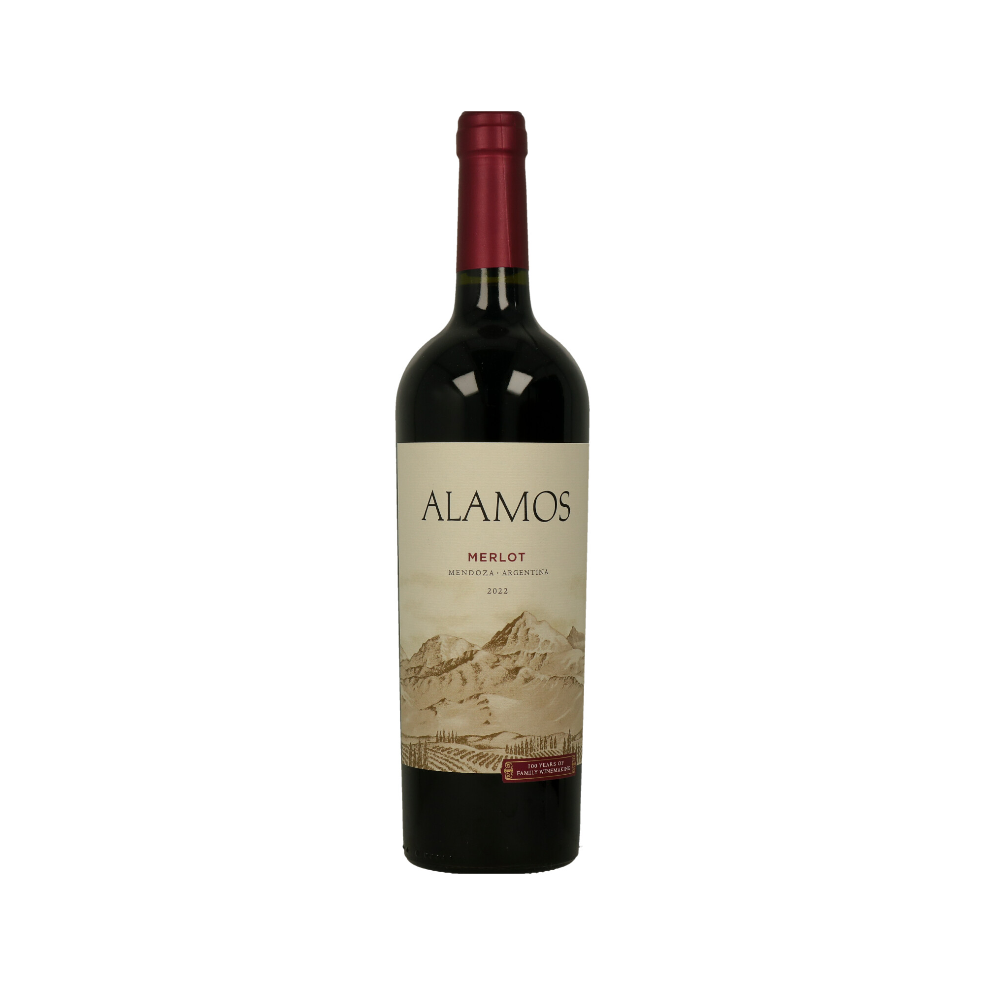 Alamos Merlot presenta un color granate profundo con tonos púrpura. En nariz, ofrece una abundancia de frutos rojos acompañados de un toque de chocolate y especias dulces.