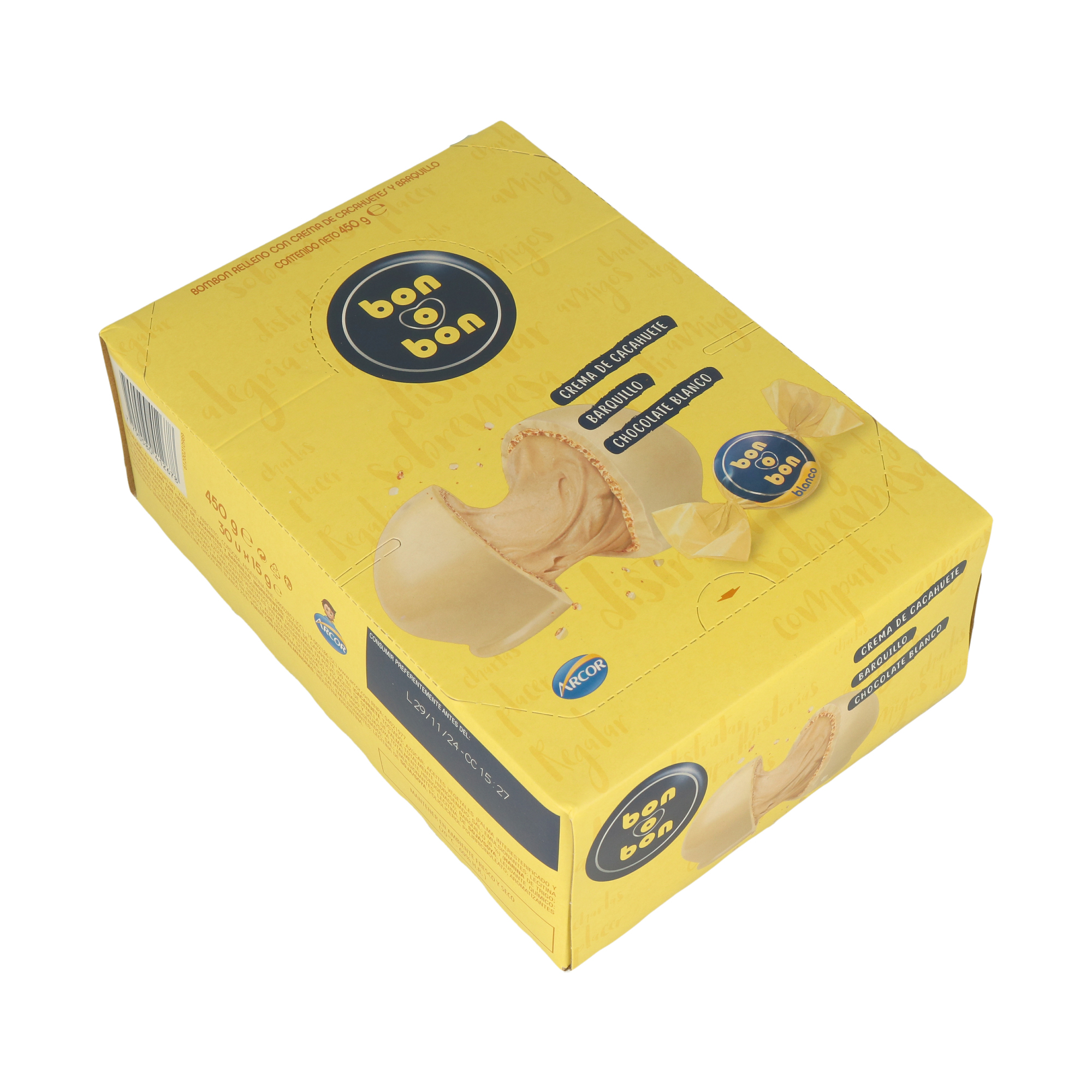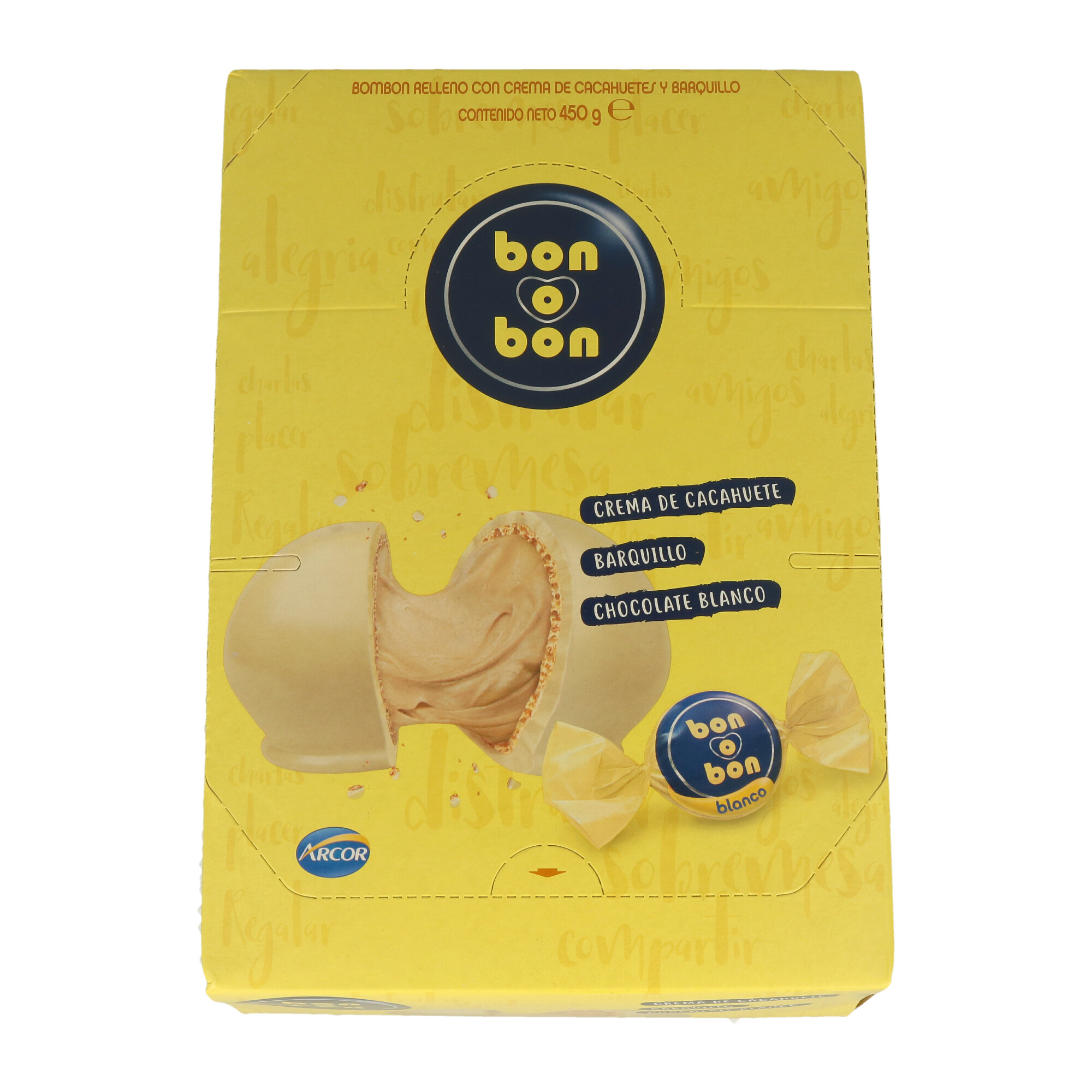 El Bombón BON O BON Blanco es una exquisita versión del clásico bombón, pero con una capa de chocolate blanco que envuelve un delicioso relleno cremoso de maní.